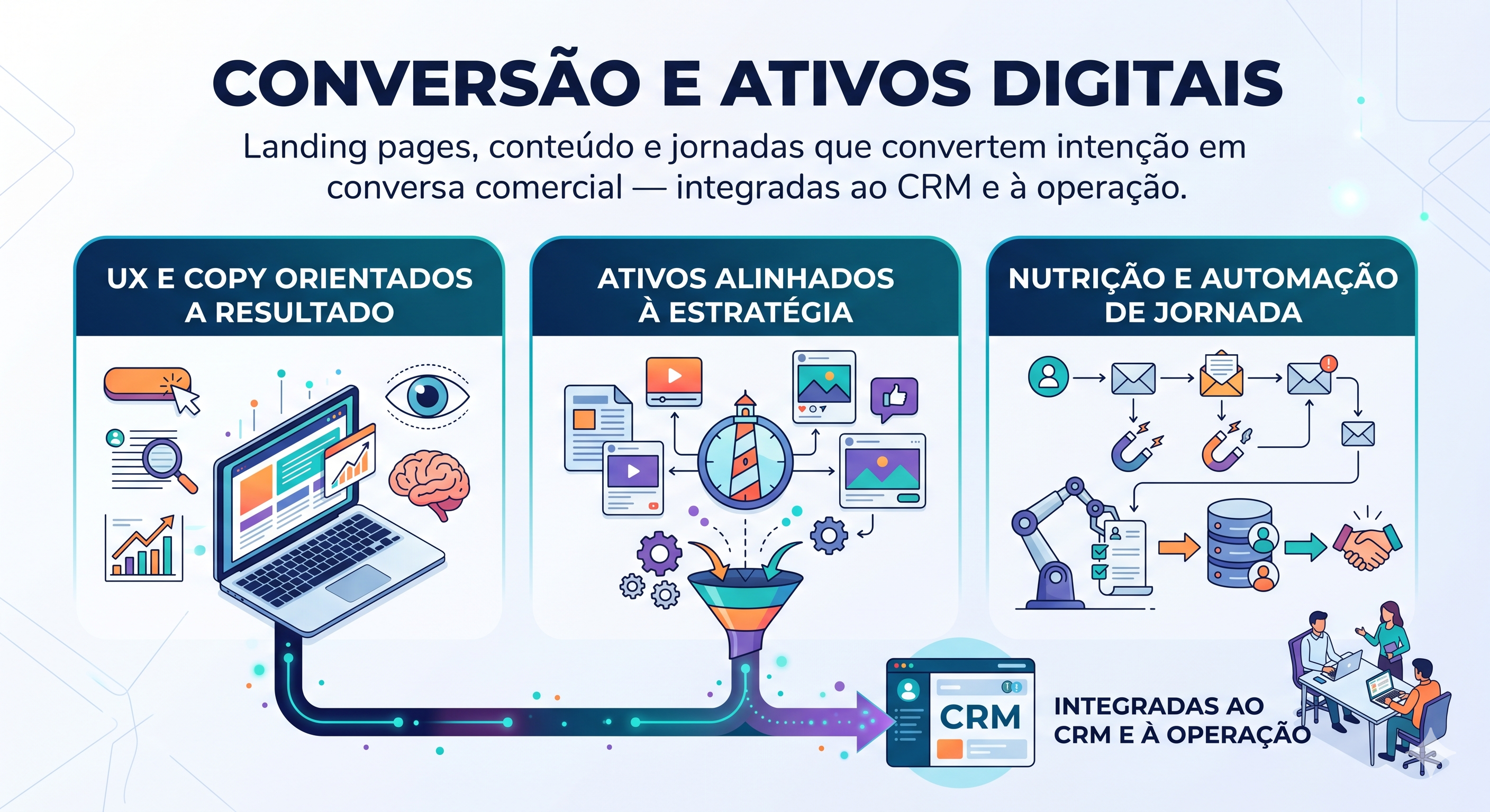 Landing pages, conteúdo e jornadas que convertem intenção em conversa comercial — integradas ao CRM e à operação.