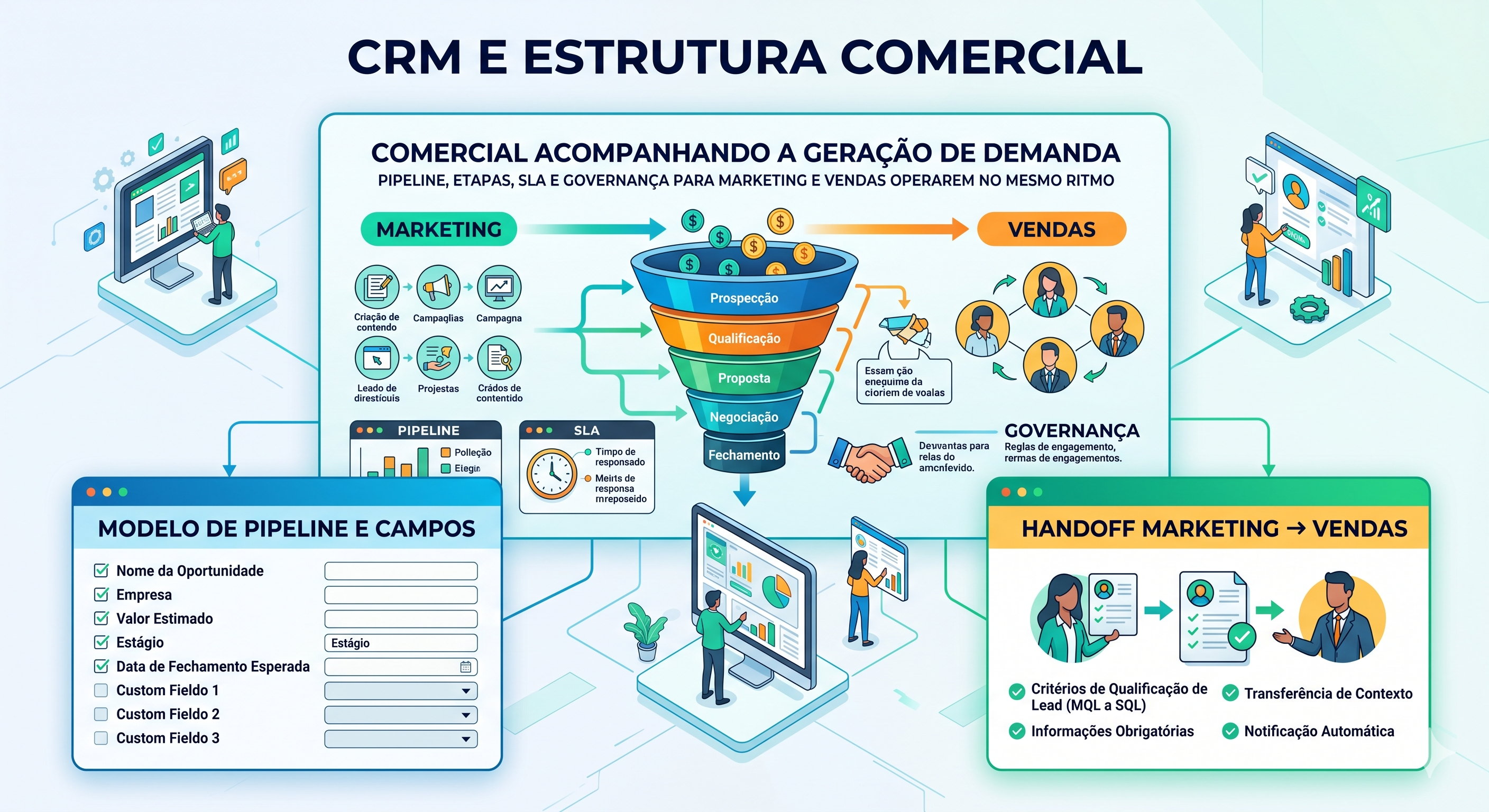 Comercial acompanhando a geração de demanda: pipeline, etapas, SLA e governança para marketing e vendas operarem no mesmo ritmo.