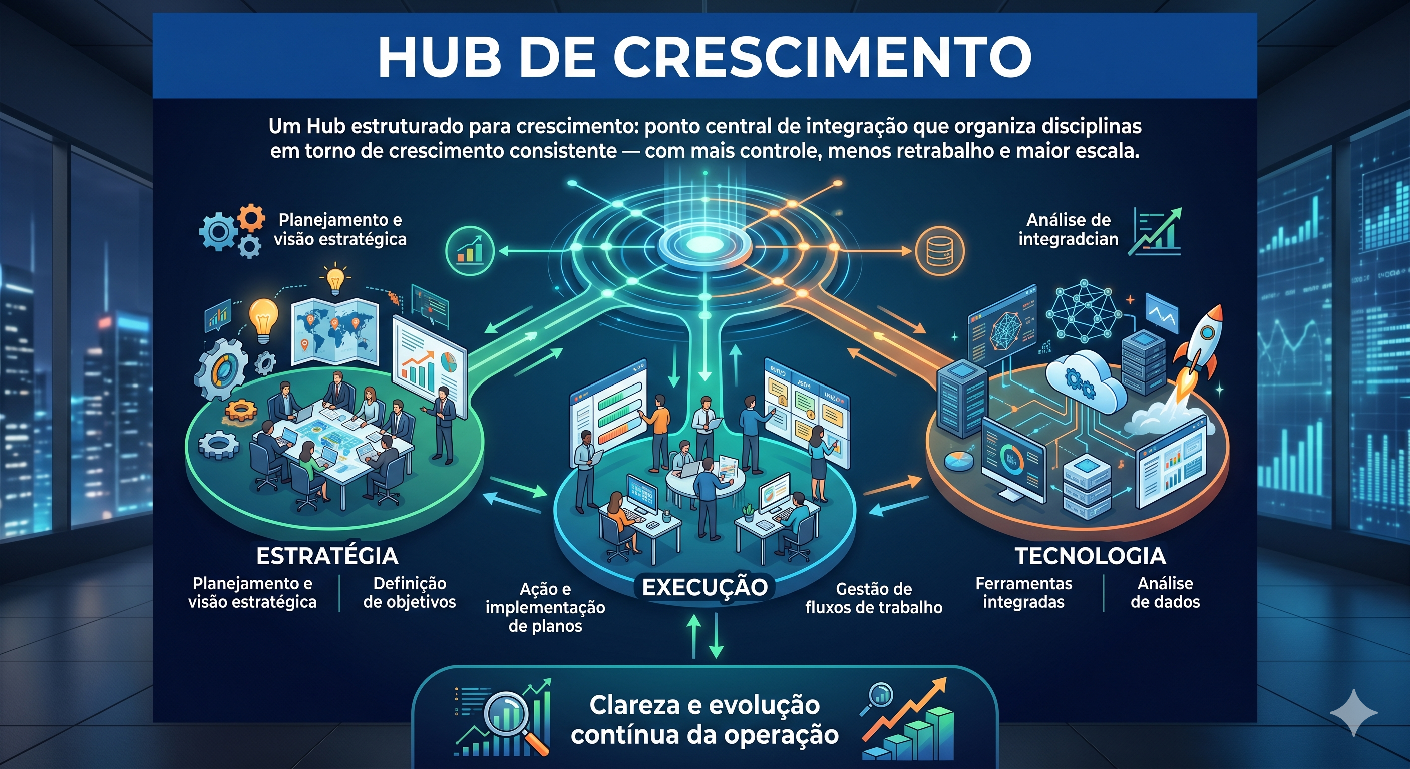 Um Hub estruturado para crescimento: ponto central de integração que organiza disciplinas em torno de crescimento consistente — com mais controle, menos retrabalho e maior escala.