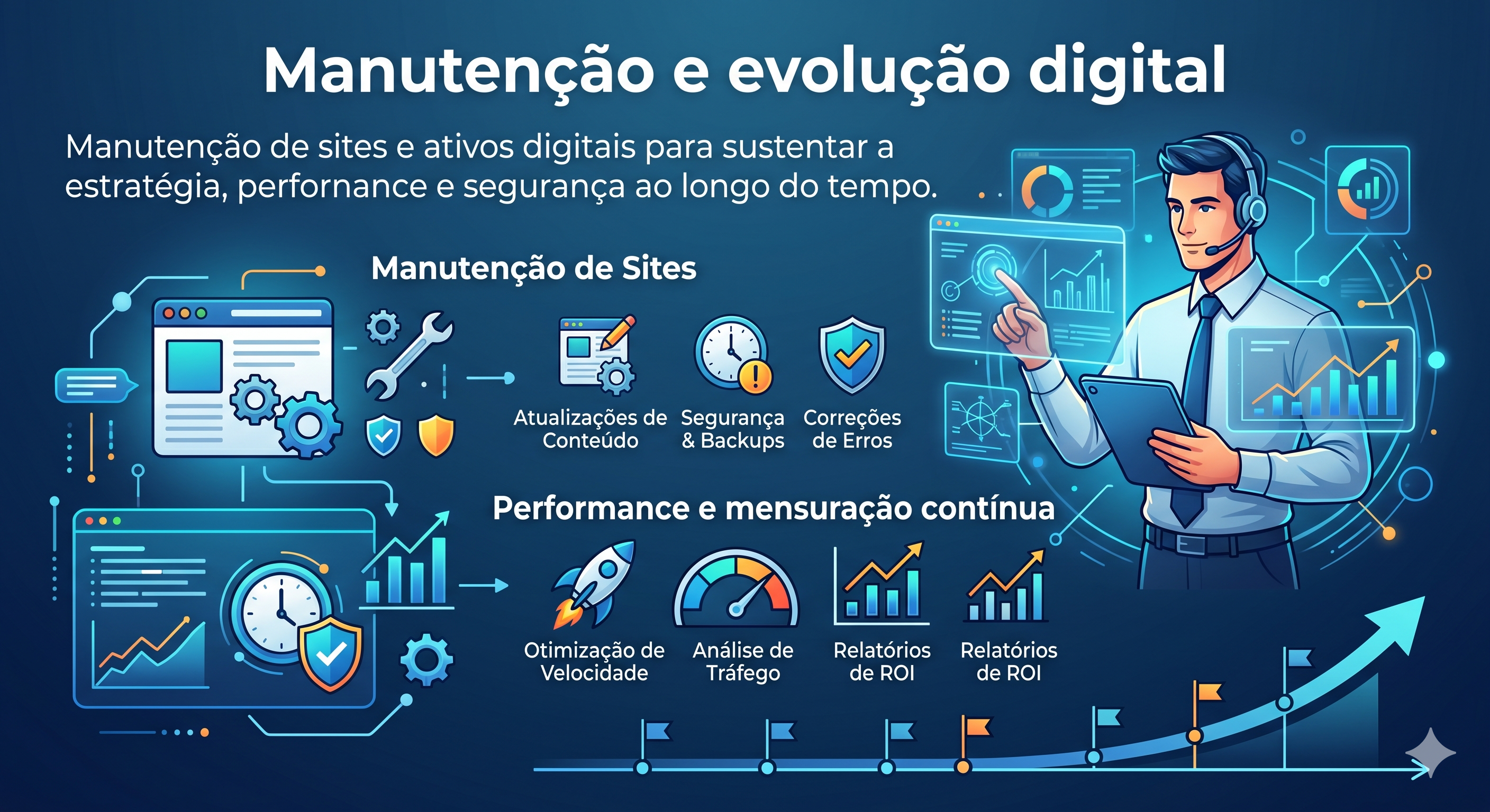 Manutenção de sites e ativos digitais para sustentar a estratégia, performance e segurança ao longo do tempo.