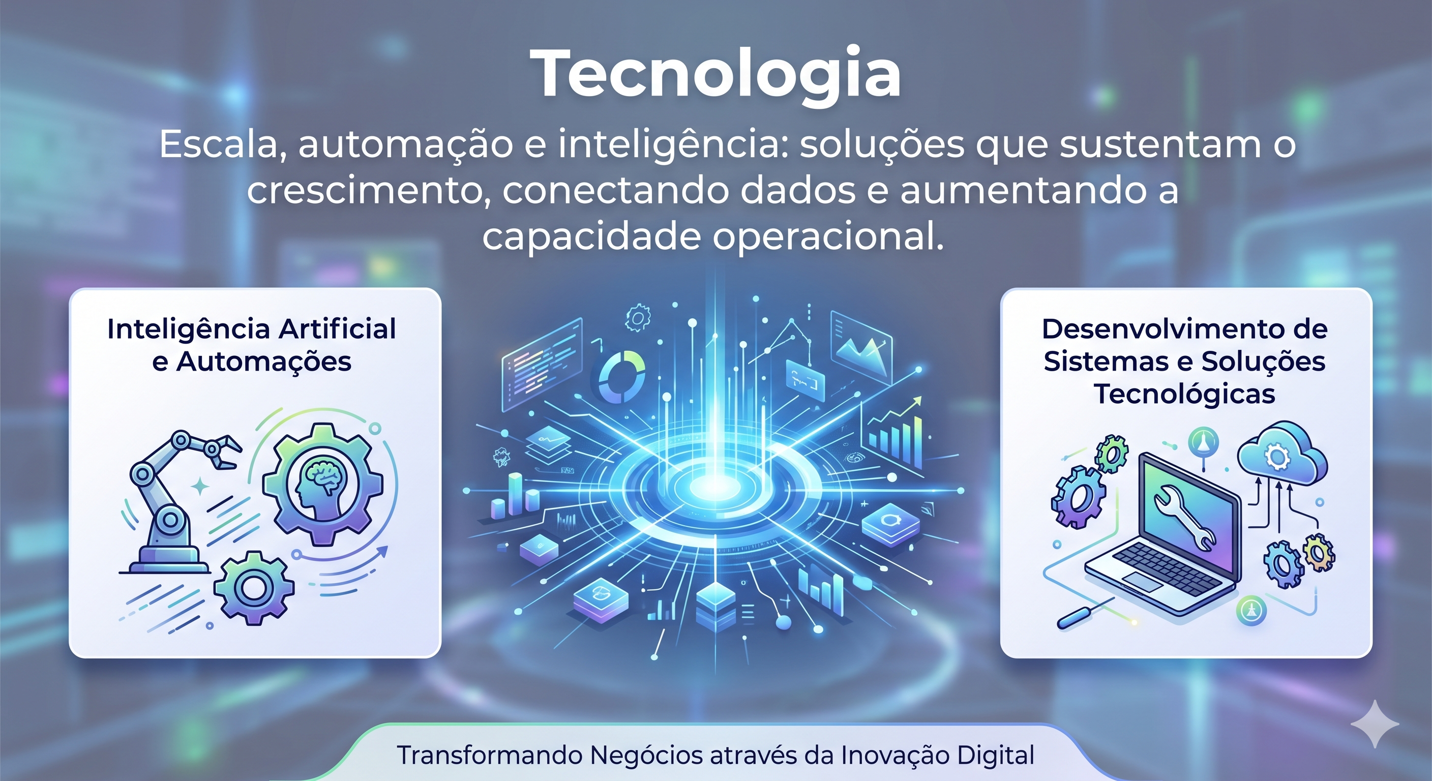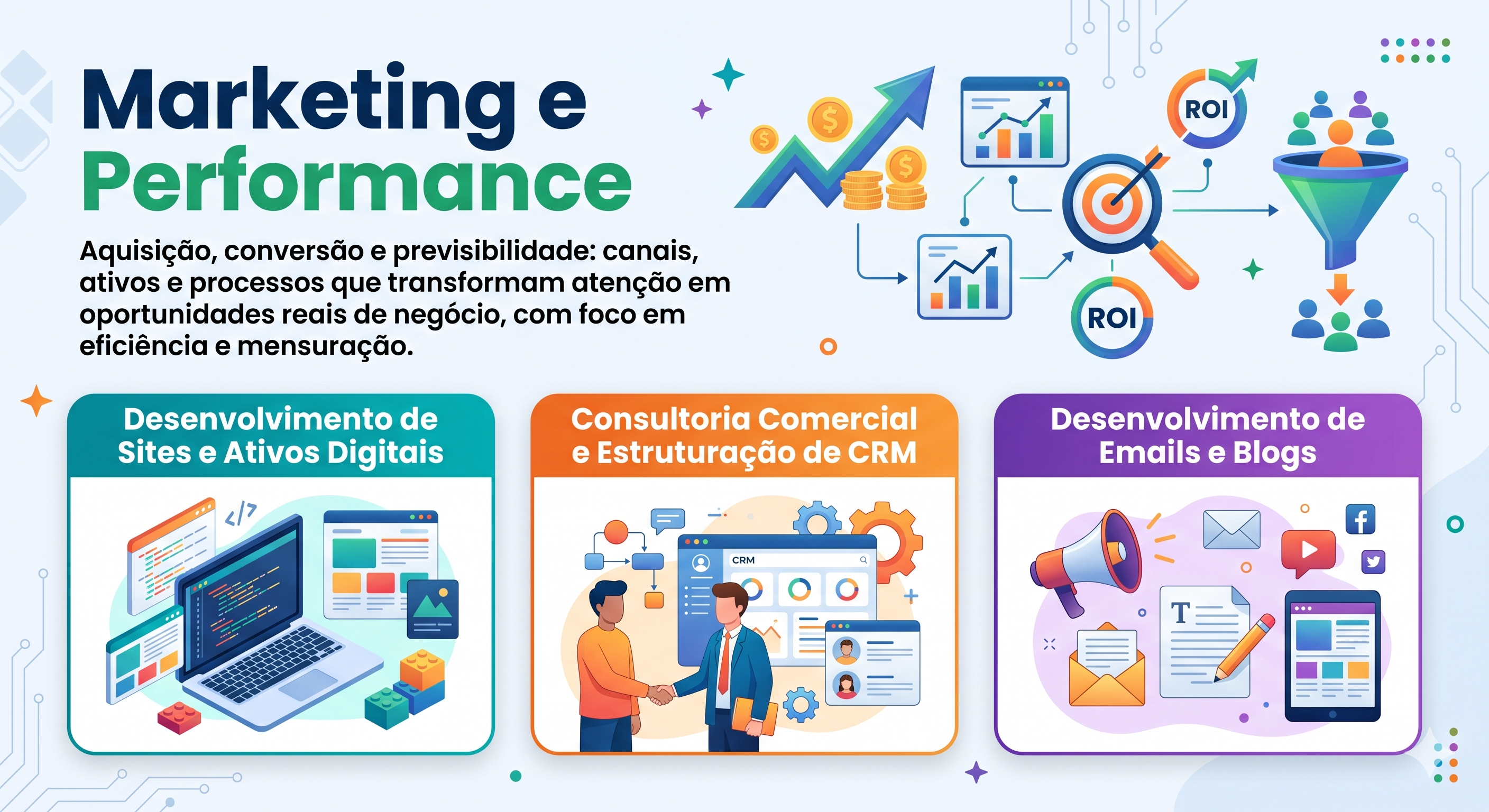 Marketing, Performance e Tecnologia integrados — aquisição, conversão, CRM, automações e sistemas no mesmo fluxo.